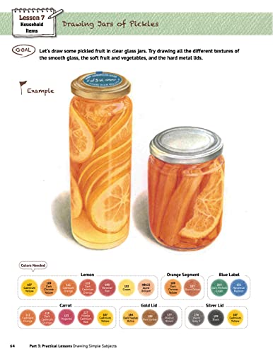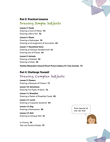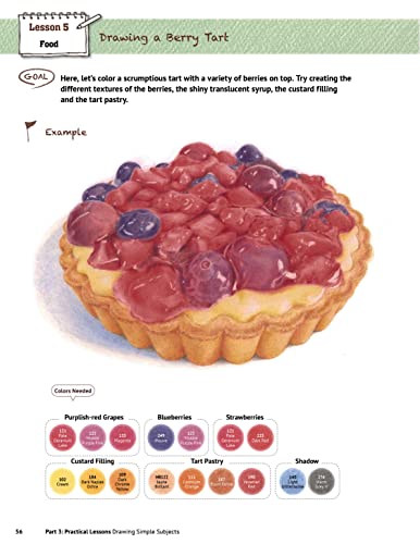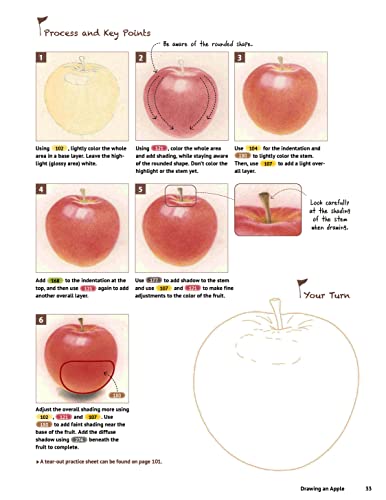Learn to create vividly realistic colored pencil drawings in just a few lessons! A Beginner’s Guide to Colored Pencil Drawing provides instructions for creating brilliantly realistic drawings featuring rich shadows, bright highlights, smooth gradients, and glowing colors. Learn at your own pace over the course of 14 easy-to-follow lessons! This complete all-in-one guide starts with the basics–drawing lines, adding colors, drawing shapes and creating gradations. Then, it provides a series of detailed lessons teaching you how to draw colorful, everyday objects, such as: Food items like burgers, breakfasts, cookies, pickles, tarts, melons, apples, asparagus and cocktails Flowers & plants such as hydrangeas, succulents, roses and carnations Household items like silverware, bottles, toys, handkerchiefs, gemstones and dolls A variety of animals including parakeets, kittens and dogs Each lesson includes blank sketch of the subject so you can focus on coloring techniques, and Faber-Castell color codes are provided so you can faithfully reproduce the example illustrations. Each lesson also includes a tear-out practice sheet with the full sketch so you can dive right in and try your hand at rendering these objects yourself! The practice template sheets are also available online to download and print at home. This book has everything you need to master a dynamic art that is affordable and satisfying. Take the 14 lessons in 14 days, like a crash course in colored pencil mastery–or take your time. Colored pencils are a favorite medium of hobbyists and increasingly embraced by fine artists as well!