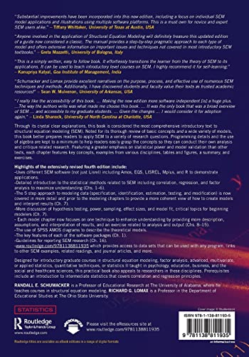 Noted for its crystal clear explanations, this book is considered the most comprehensive introductory text to structural equation modeling (SEM). Noted for its thorough review of basic concepts and a wide variety of models, this book better prepares readers to apply SEM to a variety of research questions. Programming details and the use of algebra are kept to a minimum to help readers easily grasp the concepts so they can conduct their own analysis and critique related research. Featuring a greater emphasis on statistical power and model validation than other texts, each chapter features key concepts, examples from various disciplines, tables and figures, a summary, and exercises. Highlights of the extensively revised 4th edition include: -Uses different SEM software (not just Lisrel) including Amos, EQS, LISREL, Mplus, and R to demonstrate applications. -Detailed introduction to the statistical methods related to SEM including correlation, regression, and factor analysis to maximize understanding (Chs. 1 – 6). -The 5 step approach to modeling data (specification, identification, estimation, testing, and modification) is now covered in more detail and prior to the modeling chapters to provide a more coherent view of how to create models and interpret results (ch. 7). -More discussion of hypothesis testing, power, sampling, effect sizes, and model fit, critical topics for beginning modelers (ch. 7). – Each model chapter now focuses on one technique to enhance understanding by providing more description, assumptions, and interpretation of results, and an exercise related to analysis and output (Chs. 8 -15). -The use of SPSS AMOS diagrams to describe the theoretical models. -The key features of each of the software packages (Ch. 1). -Guidelines for reporting SEM research (Ch. 16). -www.routledge.com/9781138811935 which provides access to data sets that can be used with any program, links to other SEM examples, related readings, and journal articles, and more. Reorganized, the new edition begins with a more detailed introduction to SEM including the various software packages available, followed by chapters on data entry and editing, and correlation which is critical to understanding how missing data, non-normality, measurement, and restriction of range in scores affects SEM analysis. Multiple regression, path, and factor models are then reviewed and exploratory and confirmatory factor analysis is introduced. These chapters demonstrate how observed variables share variance in defining a latent variables and introduce how measurement error can be removed from observed variables. Chapter 7 details the 5 SEM modeling steps including model specification, identification, estimation, testing, and modification along with a discussion of hypothesis testing and the related issues of power, and sample and effect sizes.Chapters 8 to 15 provide comprehensive introductions to different SEM models including Multiple Group, Second-Order CFA, Dynamic Factor, Multiple-Indicator Multiple-Cause, Mixed Variable and Mixture, Multi-Level, Latent Growth, and SEM Interaction Models. Each of the 5 SEM modeling steps is explained for each model along with an application. Chapter exercises provide practice with and enhance understanding of the analysis of each model. The book concludes with a review of SEM guidelines for reporting research. Designed for introductory graduate courses in structural equation modeling, factor analysis, advanced, multivariate, or applied statistics, quantitative techniques, or statistics II taught in psychology, education, business, and the social and healthcare sciences, this practical book also appeals to researchers in these disciplines. Prerequisites include an introduction to intermediate statistics that covers correlation and regression principles.