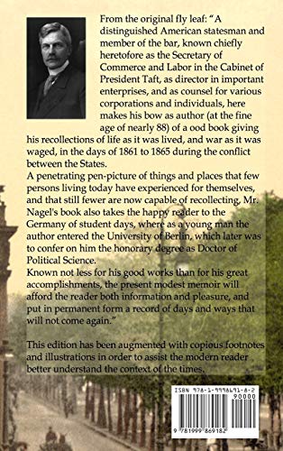 From the original fly leaf: “A distinguished American statesman and member of the bar, known chiefly heretofore as the Secretary of Commerce and Labor in the Cabinet of President Taft, as director in important enterprises, and as counsel for various corporations and individuals, here makes his bow as author (at the fine age of nearly 88) of a good book giving his recollections of life as it was lived, and war as it was waged, in the days of 1861 to 1865 during the conflict between the States. A penetrating pen-picture of things and places that few persons living today have experienced for themselves, and that still fewer are now capable of recollecting, Mr. Nagel’s book also takes the happy reader to the Germany of student days, where as a young man the author entered the University of Berlin, which later was to confer on him the honorary degree as Doctor of Political Science. Known not less for his good works than for his great accomplishments, the present modest memoir will afford the reader both information and pleasure, and put in permanent form a record of days and ways that will not come again.” This edition has been augmented with copious footnotes and illustrations to assist the modern reader to understand better the context of the time.