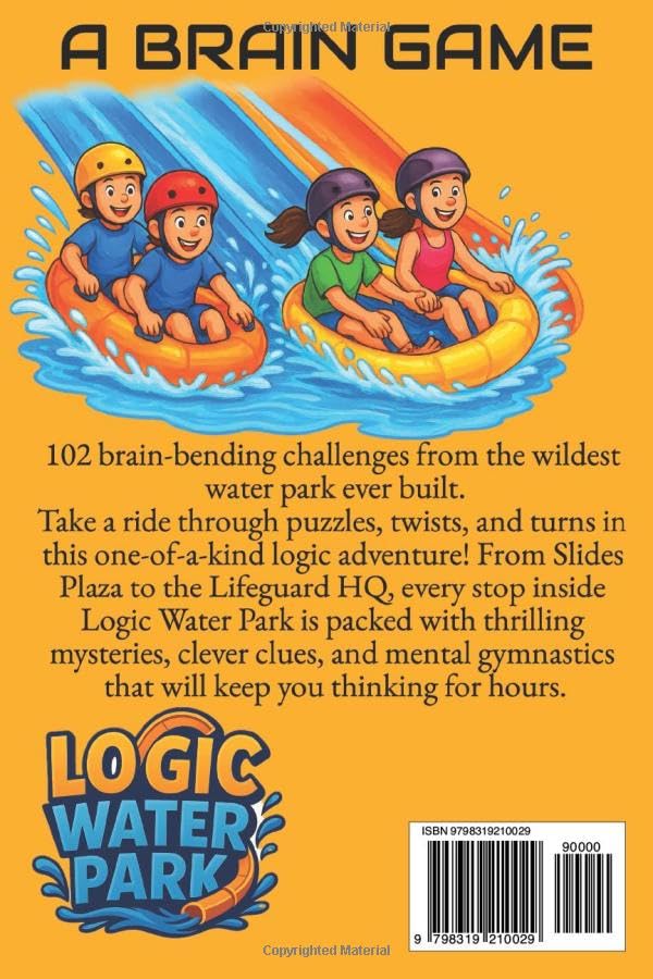 Logic Water Park – A Brain Game Book Grab your goggles and dive into the wildest puzzle adventure yet! At Logic Water Park, every splash comes with a brain-teasing twist. From flip-flop mix-ups by the Lazy River to slippery slide rankings, towel chaos, snack stand snafus, and a wave of waterslide who-dunnits–you’ll need sharp thinking, smart reasoning, and serious puzzle power to solve them all. This action-packed installment in the Brain Game series features 102 water-themed word logic puzzles designed to challenge clever kids, teens, and adults alike. Follow park guests, lifeguards, and maintenance crew as they navigate the quirks and confusion of Earth’s most chaotic water park. Think fast. Solve smart. Stay dry if you can. Perfect for ages 10 and up, this book is ideal for puzzle lovers who enjoy logic grids, deduction, process of elimination, and story-based problem-solving.