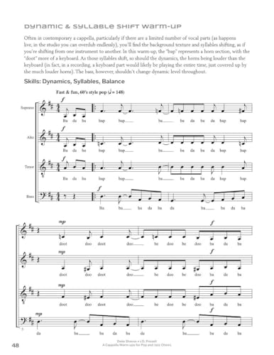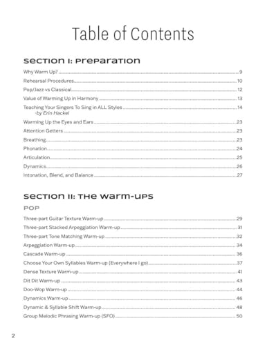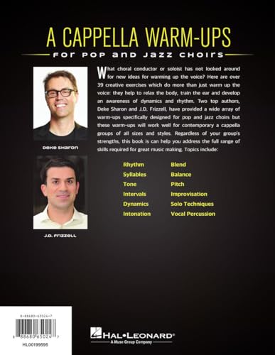 (Choral). What choral conductor or soloist has not looked around for new ideas for warming up the voice? Here are over 39 creative exercises which do more than just warm up the voice: they help to relax the body, train the ear and develop an awareness of dynamics and rhythm. Two top authors, Deke Sharon and J.D. Frizzell, have provided a wide array of warm ups specifically designed for pop and jazz choirs but these warm ups will work well for contemporary a cappella groups of all sizes and styles. Every vocal ensemble has its strengths and weaknesses which vary from year to year. The warmups within can to help polish your weak spots and hone your strengths. Regardless of your group’s strengths, this book is can help you address the full range of skills required for great musicmaking. Topics include: Rhythm, Syllables, Tone, Intervals, Dynamics, Intonation, Blend, Balance, Pitch, Improvisation, Solo Techniques, and Vocal Percussion.