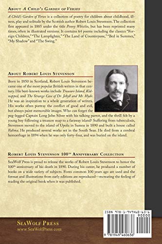 SeaWolf Press is proud to offer another book in its Robert Louis Stevenson 100th Anniversary Collection. Each book in the collection contains the text, illustrations, and cover from first or early editions. Use Amazon’s Lookinside feature to compare this edition with others. You’ll be impressed by the differences. If you like our book, be sure to leave a review! Our version has: Over 88 original illustrations by Jessie Willcox Smith. Don’t be fooled by other versions with missing or made-up pictures. Text that has been proofread to avoid errors common in other versions. A beautiful cover that reproduces an early painting. The complete text in an easy-to-read font similar to the original. Properly formatted text complete with correct indenting, spacing, footnotes, italics, and tables. Look for other Robert Louis Stevenson books in our 100th Anniversary Collection. A Child’s Garden of Verses is a collection of poetry for children about childhood, illness, play and solitude by the Scottish author Robert Louis Stevenson. The collection first appeared in 1885 under the title Penny Whistles, but has been reprinted many times, often in illustrated versions. It contains about 65 poems including the classics “Foreign Children,” “The Lamplighter,” “The Land of Counterpane,” “Bed in Summer,” “My Shadow” and “The Swing.”