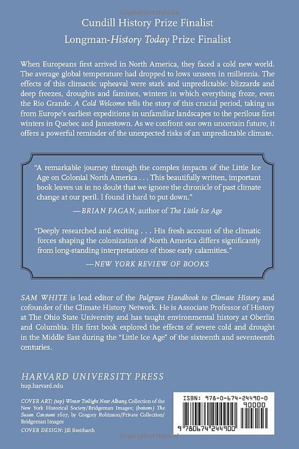 Cundill History Prize Finalist Longman-History Today Prize Finalist Winner of the Roland H. Bainton Book Prize “Meticulous environmental-historical detective work.” –Times Literary Supplement When Europeans first arrived in North America, they faced a cold new world. The average global temperature had dropped to lows unseen in millennia. The effects of this climactic upheaval were stark and unpredictable: blizzards and deep freezes, droughts and famines, winters in which everything froze, even the Rio Grande. A Cold Welcome tells the story of this crucial period, taking us from Europe’s earliest expeditions in unfamiliar landscapes to the perilous first winters in Quebec and Jamestown. As we confront our own uncertain future, it offers a powerful reminder of the unexpected risks of an unpredictable climate. “A remarkable journey through the complex impacts of the Little Ice Age on Colonial North America…This beautifully written, important book leaves us in no doubt that we ignore the chronicle of past climate change at our peril. I found it hard to put down.” –Brian Fagan, author of The Little Ice Age “Deeply researched and exciting…His fresh account of the climatic forces shaping the colonization of North America differs significantly from long-standing interpretations of those early calamities.” –New York Review of Books