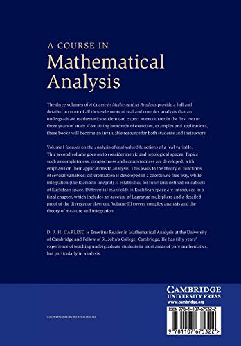 The three volumes of A Course in Mathematical Analysis provide a full and detailed account of all those elements of real and complex analysis that an undergraduate mathematics student can expect to encounter in their first two or three years of study. Containing hundreds of exercises, examples and applications, these books will become an invaluable resource for both students and teachers. Volume I focuses on the analysis of real-valued functions of a real variable. This second volume goes on to consider metric and topological spaces. Topics such as completeness, compactness and connectedness are developed, with emphasis on their applications to analysis. This leads to the theory of functions of several variables. Differential manifolds in Euclidean space are introduced in a final chapter, which includes an account of Lagrange multipliers and a detailed proof of the divergence theorem. Volume III covers complex analysis and the theory of measure and integration.