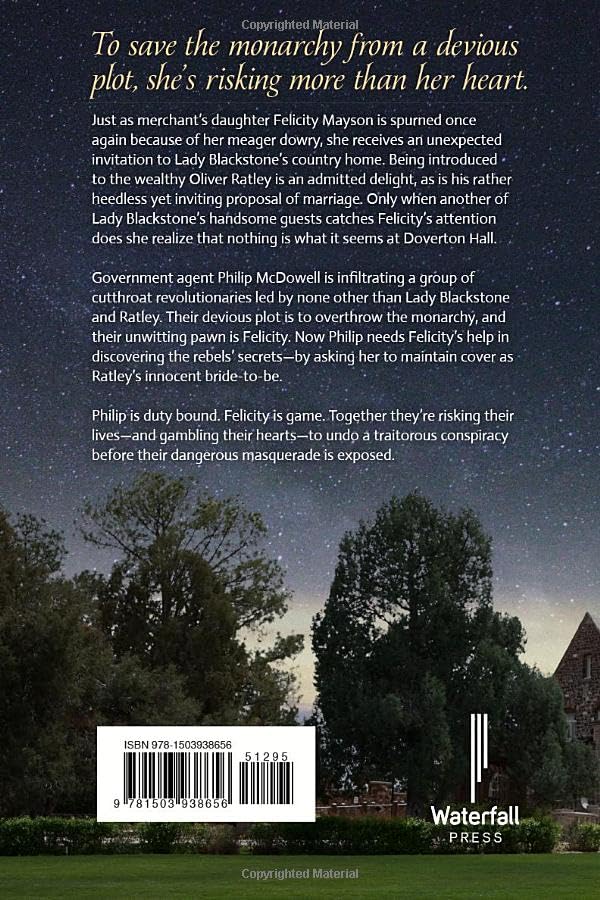 Just as merchant’s daughter Felicity Mayson is spurned once again because of her meager dowry, she receives an unexpected invitation to Lady Blackstone’s country home. Being introduced to the wealthy Oliver Ratley is an admitted delight, as is his rather heedless yet inviting proposal of marriage. Only when another of Lady Blackstone’s handsome guests catches Felicity’s attention does she realize that nothing is what it seems at Doverton Hall. Government agent Philip McDowell is infiltrating a group of cutthroat revolutionaries led by none other than Lady Blackstone and Ratley. Their devious plot is to overthrow the monarchy, and their unwitting pawn is Felicity. Now Philip needs Felicity’s help in discovering the rebels’ secrets–by asking her to maintain cover as Ratley’s innocent bride-to-be. Philip is duty bound. Felicity is game. Together they’re risking their lives–and gambling their hearts–to undo a traitorous conspiracy before their dangerous masquerade is exposed.