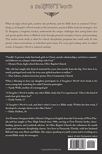 Since its release, over 50,000 young women ages twelve to eighteen have discovered A Daughter’s Worth, an interactive, practical Bible study/devotional. Author Ava Sturgeon, who has spent decades teaching both high school students and church youth, understands the complex challenges teens face and gently guides them to biblical truth through a conversational approach. In addition, opportunities for journaling throughout each chapter make each topic more personal and applicable. This twelve week study is ideal for church discipleship, mom/daughter studies, Bible study groups, or individual devotionals. Each chapter includes five short lessons that focus on one topic: embracing true beauty, managing emotions, choosing good friends, treasuring the family, dating with discretion, and fulfilling your purpose (to name a few). A brief leader’s guide with suggestions on facilitating a discussion-based Bible study appears at the back of each copy.