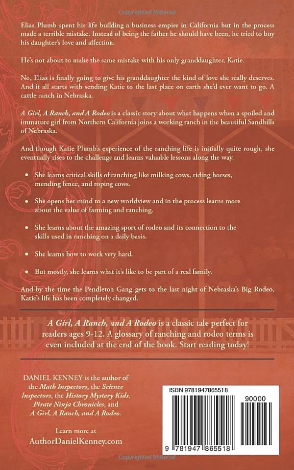 From Rodeo Rookie to Ranch Hero! ~A Spoiled City Girl Meets the Ranch Life~ Katie Plumb never wanted to leave California, but the Nebraska Sandhills have more to teach her than she ever imagined. From milking cows to mastering the rodeo, join Katie on a heartfelt journey of hard work, family, and finding herself. Bonus: Includes a glossary of ranch and rodeo terms! “A Girl, A Ranch, and A Rodeo” is a classic fish out of water story about what happens when a spoiled girl from California joins the Pendleton Ranch in the beautiful Sandhills of Nebraska. And though Katie Plumb’s experience of the ranching life is initially quite rough, she eventually rises to the challenge and learns valuable lessons along the way. Katie’s Valuable Lessons – She learns critical skills of ranching like milking cows, riding horses, mending fence, and roping cows. – She opens her mind to a new worldview and in the process learns more about the value of farming and ranching. – She learns about the amazing sport of rodeo and its connection to the skills used in ranching on a daily basis. – She learns how to work very hard. – But mostly, she learns what it’s like to be part of a real family. “A Girl, A Ranch, and A Rodeo” is a classic tale perfect for readers ages 9-12. Start reading today!