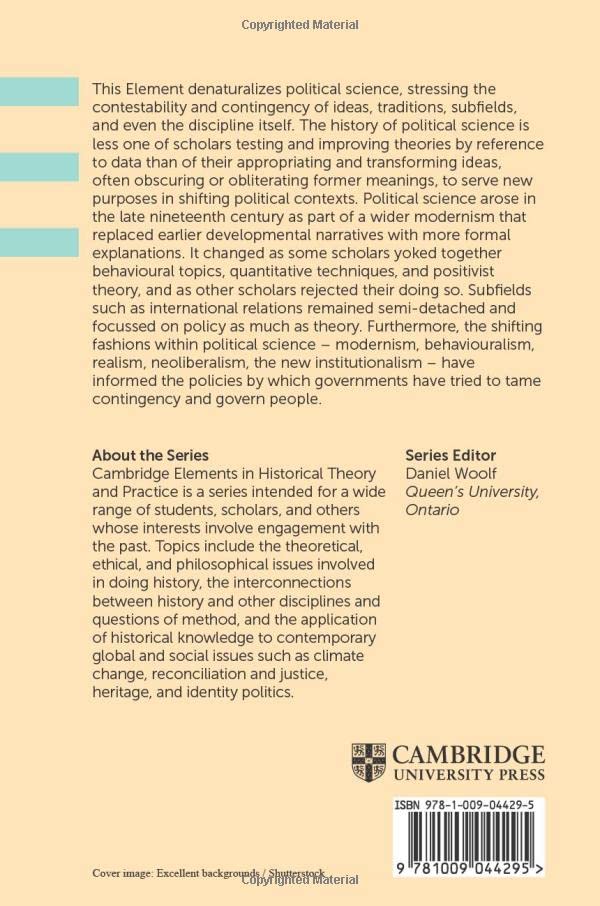 This Element denaturalises political science, stressing the contestability and contingency of ideas, traditions, subfields, and even the discipline itself. The history of political science is less one of scholars testing and improving theories by reference to data than of their appropriating and transforming ideas, often obscuring or obliterating former meanings, to serve new purposes in shifting political contexts. Political science arose in the late nineteenth century as part of a wider modernism that replaced earlier developmental narratives with more formal explanations. It changed as some scholars yoked together behavioural topics, quantitative techniques, and positivist theory, and as other scholars rejected their doing so. Subfields such as International Relations remained semi-detached and focused on policy as much as theory. Furthermore, the shifting fashions within political science – modernism, behaviouralism, realism, neoliberalism, the new institutionalism – have informed the policies by which governments have tried to tame contingency and govern people.