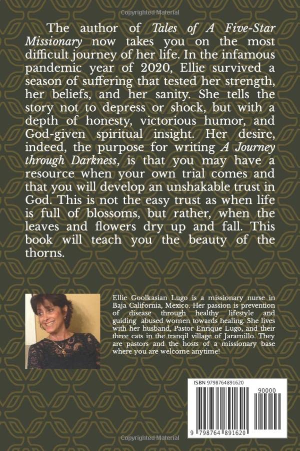 The author of Tales of A Five-Star Missionary now takes you on the most difficult journey of her life. In the infamous pandemic year of 2020, Ellie survived a season of suffering that tested her strength, her beliefs, and her sanity. She tells the story not to depress or shock, but with a depth of honesty, victorious humor, and God-given spiritual insight. Her desire, indeed, the purpose for writing A Journey through Darkness, is that you may have a resource when your own trial comes and that you will develop an unshakable trust in God. This is not the easy trust as when life is full of blooms, but rather, when the leaves and flowers dry up and fall. This book will teach you the beauty of the thorns.
