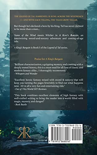 Begin the best-selling epic fantasy saga called by readers “brilliant,” “captivating,” and “a masterfully crafted adventure.” Now a complete series. The legend of Tal Harrenfel is sung across the Westreach–and with each telling, the tales grow taller. But though he’s declared a hero by his king, Tal has never claimed to be more than a man… After three decades of fighting warlocks, killing mythical beasts, and hunting enchanted treasure, Tal has had enough. Running from the deeds of his past, he retreats to his home village under a different name and meets an unlikely companion: Garin, a village boy who dreams of making a name for himself and seeing the world beyond their sleepy town. When Tal receives a mysterious visitor, both he and Garin are thrown into a journey across the kingdom. Soon, they become embroiled in the plots of monarchs, on the frontlines of an ancient war, and at the mercy of a fabled sorcerer. Now Tal must live up to his legend, and Garin discover his own power, to survive the forces pitted against them… Name of the Wind meets Witcher in A King’s Bargain, an intertwining sword and sorcery adventure and coming of age tale. If you like The Wheel of Time, The Dragonbone Chair, or The Stormlight Archive, you’ll love the captivating world of Legend of Tal.
