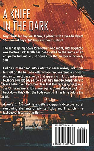 Night lasts for days on the planet Jannix, and when the sun goes down over a city brimming with corruption and organized crime, no one can be certain they’ll see another dawn. Retired police detective Jack Tarelli has turned to the bottle to cope with the long nights ever since the unsolved murder of his wife. But when he’s called to the home of an enigmatic starship tycoon just hours after a high-profile homicide, he knows his longest night yet has just begun. Led on a chase deep into the shadows of a city that never wakes, the hard-nosed and uncompromising Jack finds himself on the trail of a killer whose true motives are shrouded. Was this killing a revenge plot for an interplanetary business deal gone wrong? Or something more personal? As connections to Jack’s own bloody past rise to the surface, it becomes clear that this is more than a search for answers. It’s a race against time. And the body count is going to rise long before the sun. A Knife in the Dark is a gritty tech-noir novel combining elements of “used future” science fiction and film noir in a fast-paced, futuristic thriller.