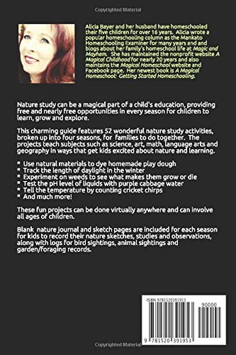 Nature study can be a magical part of a child’s education, providing free and nearly free opportunities in every season for children to learn, grow and explore. A Magical Homeschool: Nature Studies features 52 wonderful nature study activities, broken up into four seasons, for families to do together. The fun and simple projects teach subjects such as science, math, language arts and geography in ways that get kids excited about nature and learning. Use natural materials to dye homemade play dough Track the length of daylight in the winter Experiment on weeds to see what makes them grow or die Test the pH level of liquids with color-changing purple cabbage water Tell the temperature by counting cricket chirps and much more! These fun projects can be done virtually anywhere and can involve all ages of children. Nature journal pages are also included in the print version for seasonal nature sketches, nature project notes and observations, bird logs, animal logs and garden/foraging records.