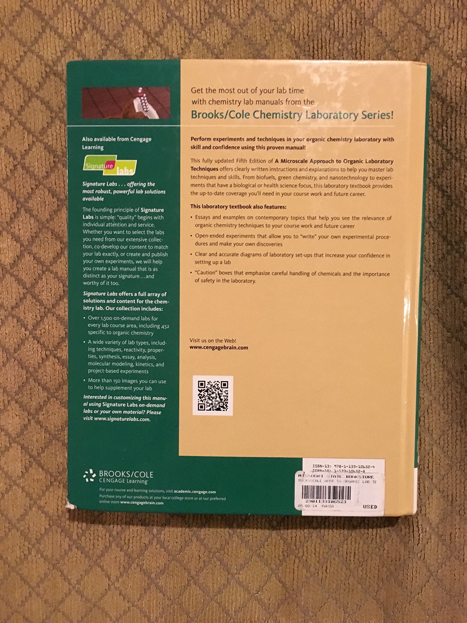 From biofuels, green chemistry, and nanotechnology, this proven laboratory textbook provides the up-to-date coverage students need in their coursework and future careers. The book’s experiments, all designed to utilize microscale glassware and equipment, cover traditional organic reactions and syntheses, the isolation of natural products, and molecular modeling and include project-based experiments and experiments that have a biological or health science focus. Updated throughout with new and revised experiments, new and revised essays, and revised and expanded techniques, the Fifth Edition is organized based on essays and topics of current interest.