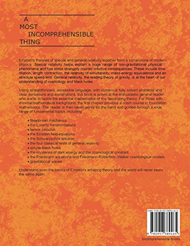Teach yourself the mathematics of relativity – THE AMAZON BESTSELLER To really understand Einstein’s theory of relativity – one of the cornerstones of modern physics – you have to get to grips with the underlying mathematics. A Most Incomprehensible Thing is aimed at the general reader who is motivated to tackle that not insignificant challenge. With a user-friendly style, clear step-by-step mathematical derivations, many fully solved problems and numerous diagrams, this self-study guide provides an accessible introduction to a fascinating but complex subject. For those with minimal mathematical background, the first chapter gives a crash course in foundation mathematics. The reader is then taken gently by the hand and guided through a wide range of fundamental topics, including Newtonian mechanics; the Lorentz transformations; the all important metric tensor gmn; tensor calculus; the Einstein field equations; the Schwarzschild solution (which gives a good approximation of the spacetime of our Solar System); black holes, relativistic cosmology and gravitational waves. Special relativity helps explain a huge range of non-gravitational physical phenomena and has some strangely counter-intuitive consequences. These include time dilation, length contraction, the relativity of simultaneity, mass-energy equivalence and an absolute speed limit. General relativity, the leading theory of gravity, is at the heart of our understanding of cosmology and black holes. Summed up in the words of eminent theoretical physicist John Archibald Wheeler: “Matter tells space how to curve. Space tells matter how to move.” “I must observe that the theory of relativity resembles a building consisting of two separate stories, the special theory and the general theory. The special theory, on which the general theory rests, applies to all physical phenomena with the exception of gravitation; the general theory provides the law of gravitation and its relations to the other forces of nature.” – Albert Einstein, 1919 Understand even the basics of Einstein’s amazing theory and the world will never seem the same again. Contents Preface Introduction 1 Foundation mathematics 2 Newtonian mechanics 3 Special relativity 4 Introducing the manifold 5 Scalars, vectors, one-forms and tensors 6 More on curvature 7 General relativity 8 The Newtonian limit 9 The Schwarzschild metric 10 Schwarzschild black holes 11 Cosmology 12 Gravitational waves Appendix: The Riemann curvature tensor Bibliography Acknowledgements By the author of A Beginner’s Guide to Differential Forms (ISBN 9780957389472) and Movement of the Spheres: Basic Astronomical Calculations Explained With 29 Spreadsheets (ISBN 9780957389489).