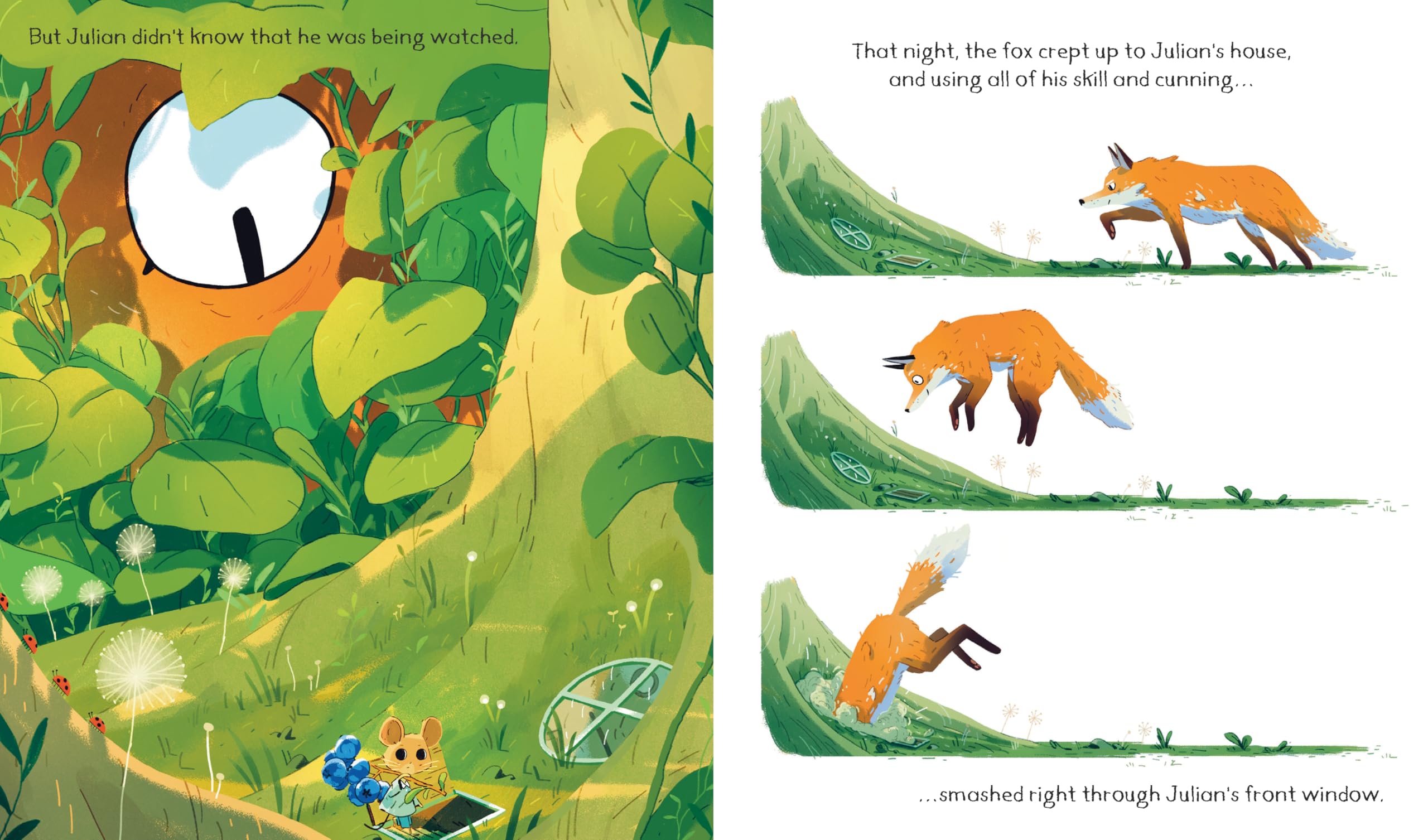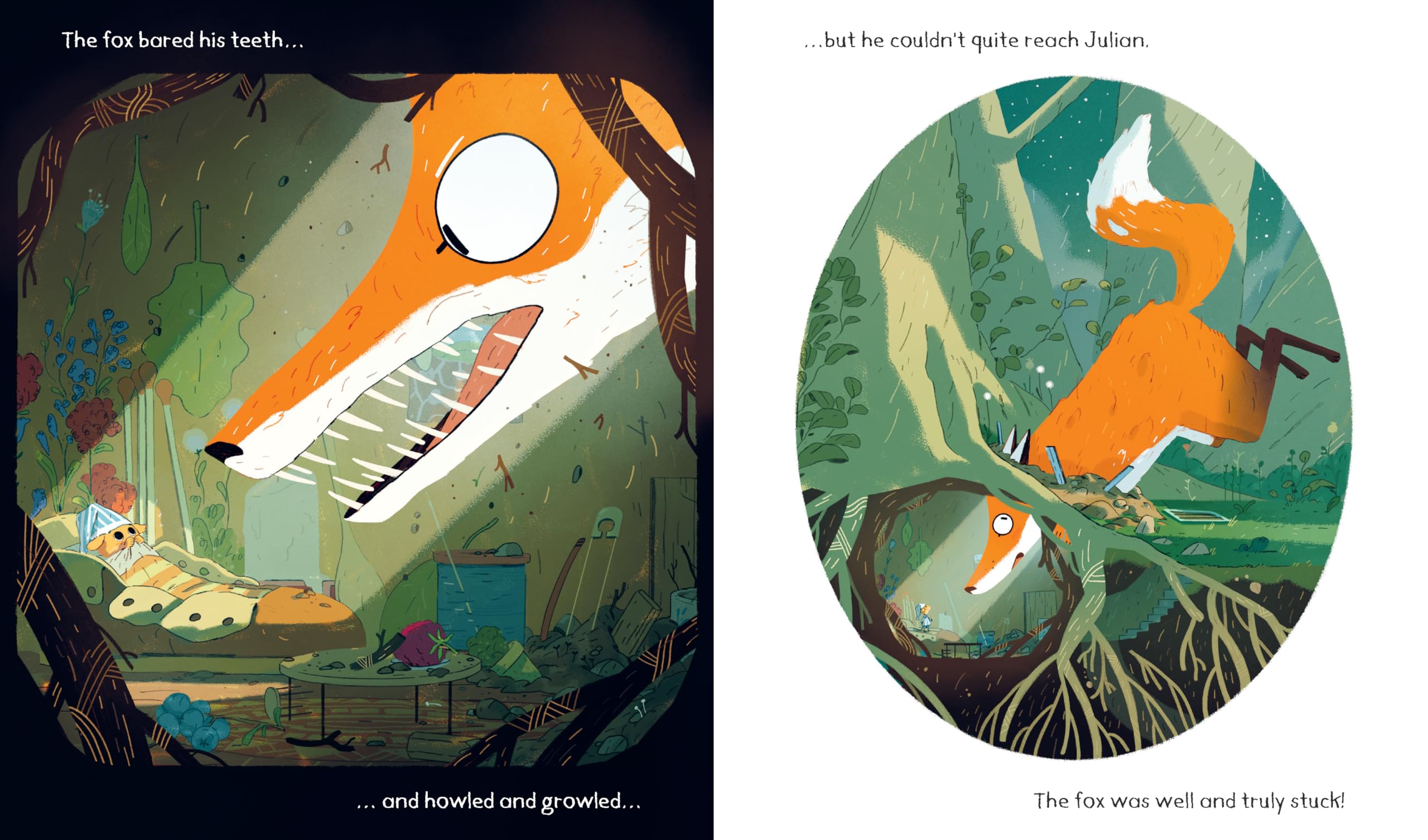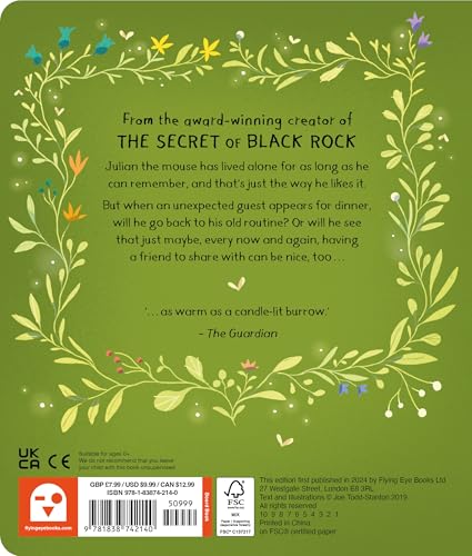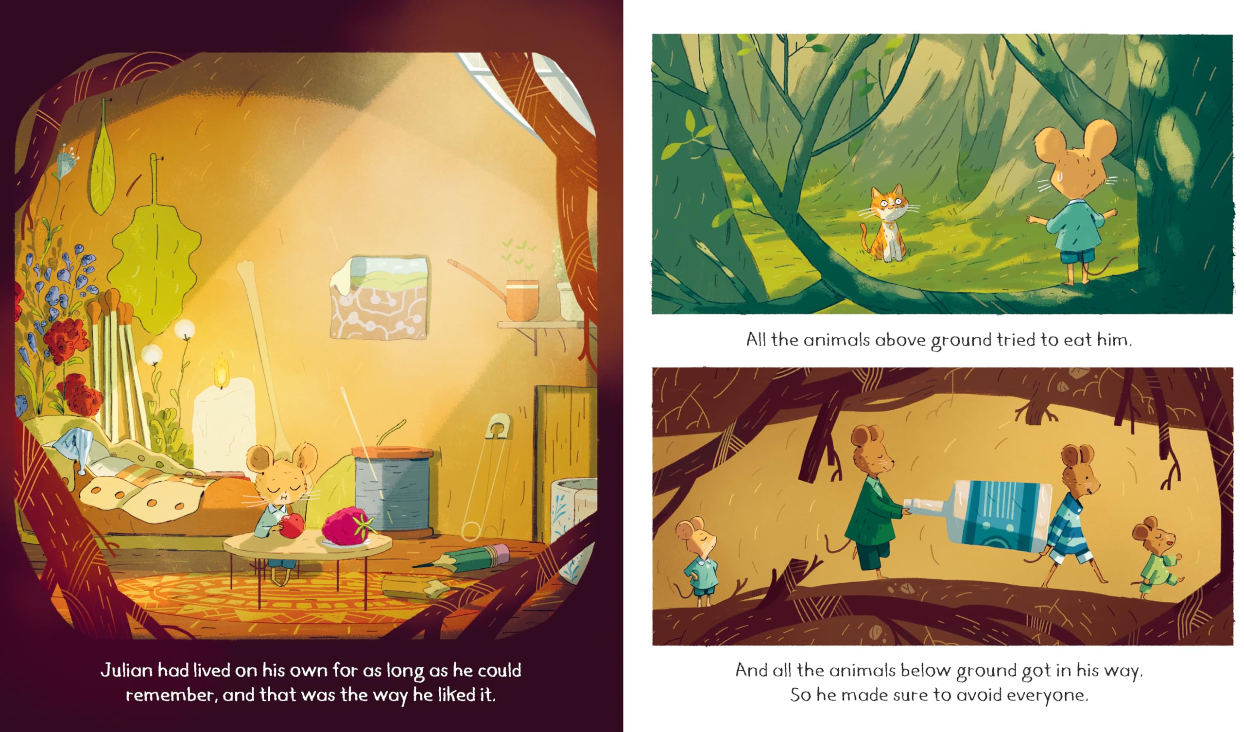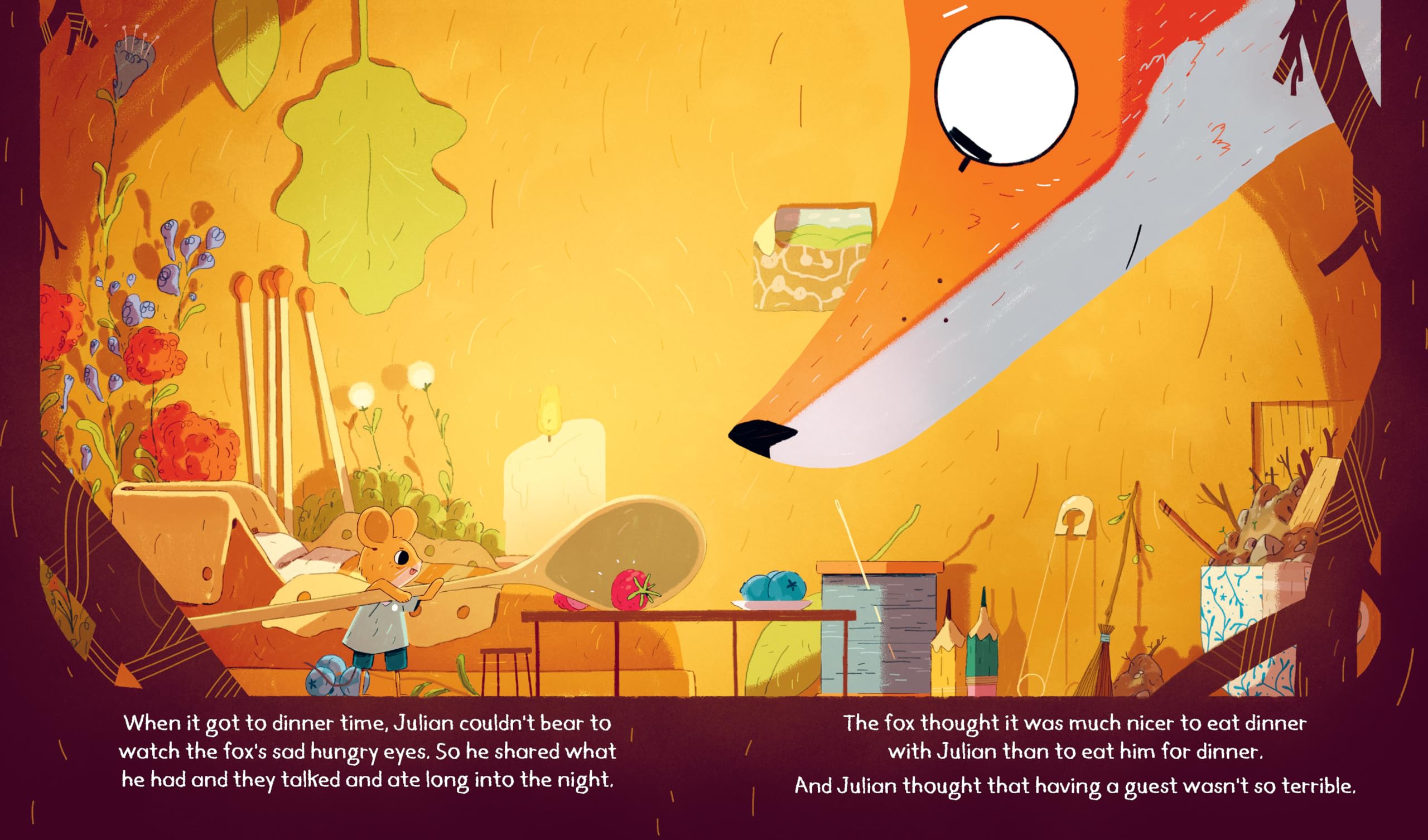 Rising star Joe Todd-Stanton brings his unique, modern illustration style to an inversion of the classic Aesop Fable of The Lion and the Mouse, as Julian the Mouse learns that sometimes, having a friend over for dinner can be just the right amount of variety in your day. When the fox tries to sneak into Julian’s burrow for a tasty bite of mouse, it finds itself stuck headfirst in Julian’s front door! At first alarmed and wary, they soon find themselves having a lovely dinner together, and it’s not long before each realizes that they have found in the other a lifelong friend.