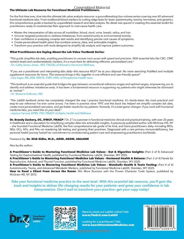Lab Results Are Just the Beginning–What Are You Missing? Most practitioners check lab values. Few truly understand them. A patient walks into your office, frustrated. Their lab work is “normal,” yet their symptoms persist. Fatigue, brain fog, unexplained weight gain–but the numbers don’t explain why. So, you dig deeper. You spend hours researching, cross-referencing markers, trying to connect the dots. But what if you’re missing critical clues hiding in plain sight? Book 1: Foundations of Health Testing: (Part 1 of 4) Base-Level Blood Labs, Cardiometabolic, & Nutrition This first volume in A Practitioner’s Guide to Mastering Functional Medicine Lab Values lays the groundwork for lab analysis, helping you move beyond surface-level readings to uncover real insights. With 497 pages of clinical depth and detail, this book provides everything you need to feel clinically confident in lab interpretation, including: 201 Blood Markers – Covering serum, cellular, standard blood labs, advanced blood labs, and micronutrient assessments Complete Urinalysis – Traditional and optimal markers for deeper metabolic insights 21 Common Blood Patterns – revealing hidden connections between markers Unit Conversion Resources – Easily interpret international lab values 35 Pages of Additional References- NEVER BEFORE compiled in one resource, tools, references, and functional medicine insights to streamline your workflow Deep Dive Into Essential Panels Complete Blood Count (CBC) – Recognizing patterns beyond anemia and infection Comprehensive Metabolic Panel (CMP) – Identifying subtle imbalances that impact overall health Anemia Panel – Detecting early and functional deficiencies in iron, B12, folate, and more Lipids & Cardiometabolic Markers – Uncovering deeper risk factors for metabolic dysfunction Inflammation & Fatty Acids – Connecting chronic inflammation and essential fatty acid imbalances Sugar Panel – Going beyond glucose and A1C to assess insulin resistance and metabolic health Thyroid Markers – Understanding the full picture beyond TSH, including free T3, free T4, reverse T3, and antibodies Nutrient Levels – Detecting hidden vitamin, mineral, antioxidant, and micronutrient deficiencies This isn’t just a reference–it’s a clinical blueprint for making better decisions, faster. Whether you’re new to functional medicine or looking to refine your approach, this book provides the clarity, structure, and real-world application you need to transform lab data into actionable patient outcomes. Meet Your Author Dr. Z has trained thousands of practitioners worldwide in functional medicine, bridging the gap between conventional lab analysis and deeper functional insights. With over 20 years of clinical experience and extensive research, this series distills the most important lab interpretation strategies into a streamlined, go-to resource for practitioners who demand accuracy and efficiency. But what if your approach to labs has been incomplete all along? What if standard lab ranges are missing early warning signs of dysfunction? What if the answers are right in front of you–if only you knew what to look for? That’s exactly what this book will teach you. Be the practitioner who sees what others miss. Get A Practitioner’s Guide to Mastering Functional Medicine Lab Values, Book 1 today and start interpreting labs with confidence, uncovering hidden imbalances, and delivering better patient outcomes.