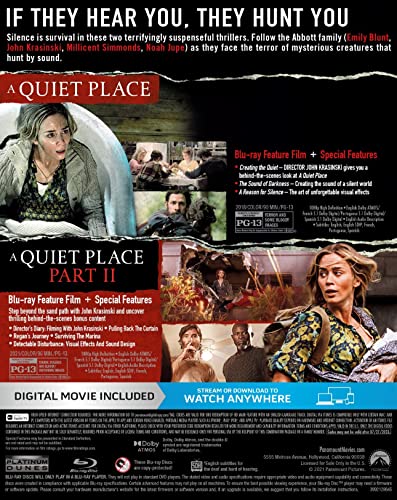 Two-disc set includes: A Quiet Place (2018)With the planet decimated by voracious alien attackers that can target their prey via the slightest sound, Evelyn and Lee Abbott (Emily Blunt, John Krasinski) managed to carve out a backwoods survival for themselves, son Marcus (Noah Jupe), and hearing-impaired daughter Regan (Millicent Simmonds). How long, though, will they be able to maintain a life of forced silence before they give away their presence? Director Krasinski’s effective, near-dialogue free hit shocker co-stars Cade Woodward. 90 min. C/Rtg: PG-13 A Quiet Place, Part II (2020)Evelyn Abbott (Emily Blunt) and her children, Regan (Millicent Simmonds) and Marcus (Noah Jupe), must leave the relative safety-and silence-of their home in the wake of a devastating loss. Vulnerable out in the open, the Abbotts come to the sobering realization that there may be enemies more dangerous than the deadly alien monsters that can track them by even the lowest noises. Cillian Murphy, Djimon Hounsou, and John Krasinski (who also directed) co-star in this thrilling sequel to the 2018 hit. 96 min. C/Rtg; PG-13 Widescreen; Soundtracks: English, French Dolby Digital 5.1, Spanish Dolby Digital 5.1, Portuguese Dolby Digital 5.1; Subtitles: English (SDH), French, Spanish, Portuguese.