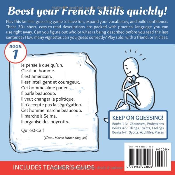 Read riddles and boost your French skills quickly! A quoi je pense ? / What am I thinking of?is a popular guessing game that teases the brain. This seven-book series presents descriptions of over 200 nouns, each one written a bit like a riddle. Line by line, clue by clue, you will piece together a picture of who or what is being described. Written in easy-to-understand, present-tense French, the riddles in these books will keep you guessing, having fun, and absorbing the language naturally. To further your learning, each riddle is followed by a variety of open-ended questions which can be answered aloud or in writing. In addition, there is a diverse collection of full-page images which offer an opportunity to write your own riddles in French, following the pattern established in the books. Two short guides, one for independent learners and one for teachers, are included in each book and provide instructions on how to get the most out of the series. Books 1, 2, and 3 feature familiar people, characters, creatures, and professions. Books 4 and 5 feature familiar events, emotions, and things- including animals, food, clothing, gadgets, and more. Books 6 and 7 feature familiar sports, activities, places, and monuments. The seven books in the A quoi je pense?series are designed to help beginning French learners acquire useful, everyday language and progress naturally to their next level. This series can easily be used and adapted for more advanced learners as well. Recommended for middle school and above. Amusez-vous bien!