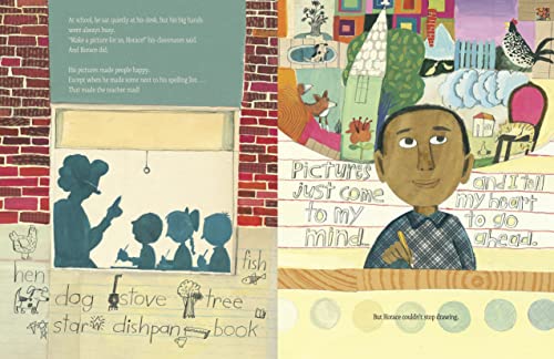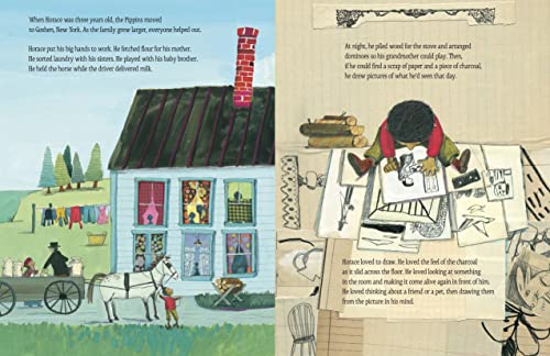 A Robert F. Sibert Honor Book Winner of the Schneider Family Book Award An ALA-ALSC Notable Children’s Book Winner of the NCTE Orbis Pictus Award for Outstanding Nonfiction for Children As a child in the late 1800s, Horace Pippin loved to draw: He loved the feel of the charcoal as it slid across the floor. He loved looking at something in the room and making it come alive again in front of him. He drew pictures for his sisters, his classmates, his co-workers. Even during W.W.I, Horace filled his notebooks with drawings from the trenches . . . until he was shot. Upon his return home, Horace couldn’t lift his right arm, and couldn’t make any art. Slowly, with lots of practice, he regained use of his arm, until once again, he was able to paint–and paint, and paint! Soon, people–including the famous painter N. C. Wyeth–started noticing Horace’s art, and before long, his paintings were displayed in galleries and museums across the country. Jen Bryant and Melissa Sweet team up once again to share this inspiring story of a self-taught painter from humble beginnings who despite many obstacles, was ultimately able to do what he loved, and be recognized for who he was: an artist.