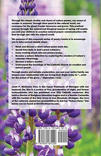 Through the simple rhythm and rhyme of nature poems, our sense of wonder is aroused. Through time spent in the natural world, our reverence for the great Creator blossoms and grows. This poetical journey through the natural and liturgical season of spring will enable you and your children to practice natural prayer–communication with God through and with His natural world. The purpose of this seasonal series of poetry books is to encourage you to take several simple steps: – Read and discuss a short nature poem each day. – Spend time daily in God’s great outdoors. – Enjoy reading aloud relevant picture books. – Become a nature detective by exploring the wonders of nature’s calendar–Phenology. – Become a nature mentor. – Understand the teachings of the Catholic Church on creation and natural prayer. Through poetry and outside exploration, you and your entire family can deepen your relationship with our loving God. Begin today to “. . . exist for the praise of his glory . . .” (Ephesians 1:12).