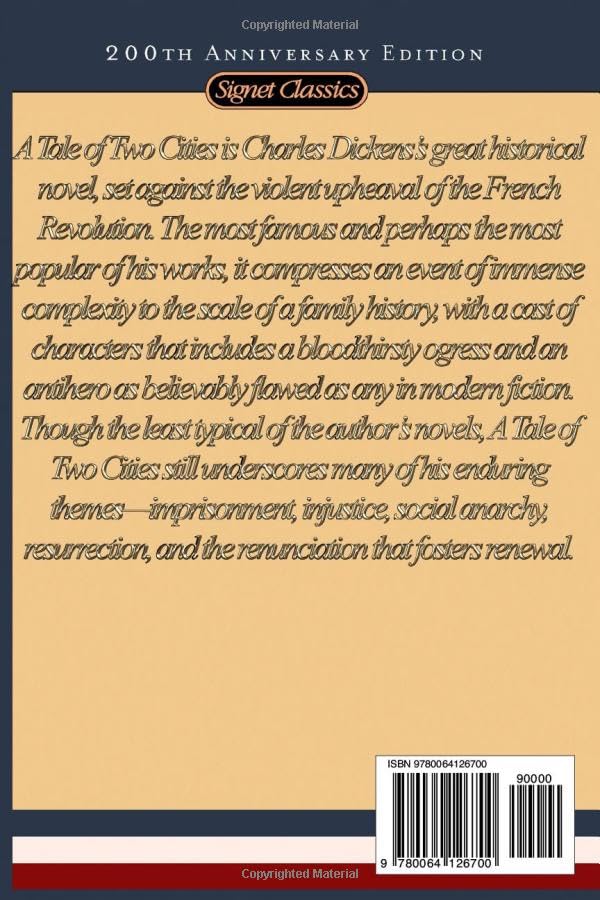 A Tale of Two Cities is Charles Dickens’s great historical novel, set against the violent upheaval of the French Revolution. The most famous and perhaps the most popular of his works, it compresses an event of immense complexity to the scale of a family history, with a cast of characters that includes a bloodthirsty ogress and an antihero as believably flawed as any in modern fiction. Though the least typical of the author’s novels, A Tale of Two Cities still underscores many of his enduring themes–imprisonment, injustice, social anarchy, resurrection, and the renunciation that fosters renewal.