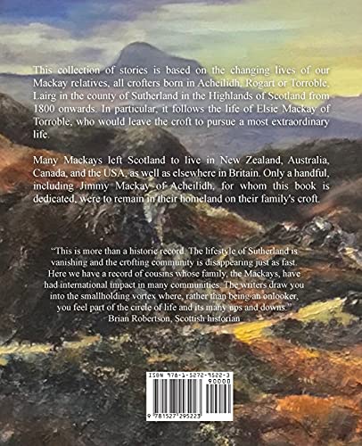 This collection of stories is based on the changing lives of our Mackay relatives, all crofters born in Acheilidh, Rogart or Torroble, Lairg in the county of Sutherland in the Highlands of Scotland from 1800 onwards. In particular, it follows the life of Elsie Mackay of Torroble, who would leave the croft to pursue a most extraordinary life. Many Mackays left Scotland to live in New Zealand, Australia, Canada, and the USA, as well as elsewhere in Britain. Only a handful, including Jimmy Mackay of Acheilidh, for whom this book is dedicated, were to remain in their homeland on their family’s croft.