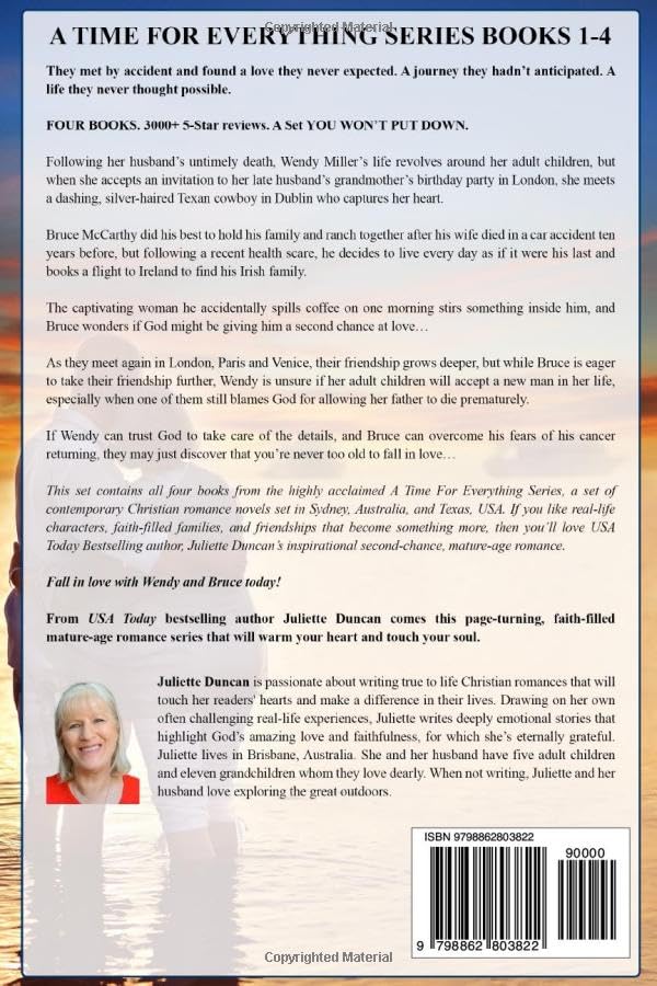 They met by accident and found a love they never expected. A journey they hadn’t anticipated. A life they never thought possible. FOUR BOOKS. 3000+ 5-Star reviews. A Set YOU WON’T PUT DOWN. Following her husband’s untimely death, Wendy Miller’s life revolves around her adult children, but when she accepts an invitation to her late husband’s grandmother’s birthday party in London, she meets a dashing, silver-haired Texan cowboy in Dublin who captures her heart. Bruce McCarthy did his best to hold his family and ranch together after his wife died in a car accident ten years before, but following a recent health scare, he decides to live every day as if it were his last and books a flight to Ireland to find his Irish family. The captivating woman he accidentally spills coffee on one morning stirs something inside him, and Bruce wonders if God might be giving him a second chance at love… As they meet again in London, Paris and Venice, their friendship grows deeper, but while Bruce is eager to take their friendship further, Wendy is unsure if her adult children will accept a new man in her life, especially when one of them still blames God for allowing her father to die prematurely. If Wendy can trust God to take care of the details, and Bruce can overcome his fears of his cancer returning, they may just discover that you’re never too old to fall in love… This set contains all four books from the highly acclaimed A Time For Everything Series, a set of contemporary Christian romance novels set in Sydney, Australia, and Texas, USA. If you like real-life characters, faith-filled families, and friendships that become something more, then you’ll love USA Today Bestselling author, Juliette Duncan’s inspirational second-chance, mature-age romance. Fall in love with Wendy and Bruce today! From USA Today bestselling author Juliette Duncan comes this page-turning, faith-filled mature-age romance series that will warm your heart and touch your soul.