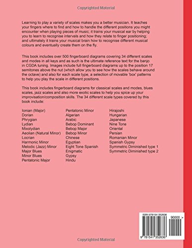 Learning to play a variety of scales makes you a better musician. It teaches your fingers where to find and how to handle the different positions you might encounter when playing pieces of music; it trains your musical ear by helping you to learn to recognise intervals and how they relate to finger positioning; and ultimately it trains your musical brain how to recognise different musical colours and eventually create them on the fly. This book includes over 500 fingerboard diagrams covering 34 different scales and modes in all keys and as such is the ultimate reference text for the banjo in CGDA tuning. Images include full fingerboard diagrams up to the position 17 semitones above the nut (which allow you to see how the scales behave around the octave) and also for each scale type, a selection of movable `box’ patterns to help you play the scale in different positions. This book includes fingerboard diagrams for classical scales and modes, blues scales, jazz scales and also more exotic scales to help you spice up your improvisation/composition skills. The 34 different scale types covered by this book include: Ionian (Major) Dorian Phrygian Lydian Mixolydian Aeolian (Natural Minor) Locrian Harmonic Minor Melodic (Jazz) Minor Major Blues Minor Blues Pentatonic Major Pentatonic Minor Algerian Arabic Bebop Dominant Bebop Major Bebop Minor Chinese Egyptian Eight Tone Spanish Enigmatic Gypsy Hindu Hirajoshi Hungarian Japanese Nine Tone Oriental Persian Romanian Minor Spanish Gypsy Symmetric Diminished type 1 Symmetric Diminished type 2