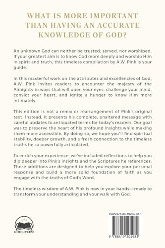 What is more important than having an accurate knowledge of God? An unknown God can neither be trusted, served, nor worshiped. If your greatest aim is to know God more deeply and worship Him in spirit and truth, this timeless compilation by A.W. Pink is your guide. In this masterful work on the attributes and excellencies of God, A.W. Pink invites readers to encounter the majesty of the Almighty in ways that will open your eyes, challenge your mind, convict your heart, and ignite a hunger to know Him more intimately. This edition is not a remix or rearrangement of Pink’s original text. Instead, it presents his complete, unaltered message with careful updates to antiquated terms for today’s readers. Our goal was to preserve the heart of his profound insights while making them more accessible. By doing so, we hope you’ll find spiritual stability, deeper growth, and a fresh connection to the timeless truths he so powerfully articulated. To enrich your experience, we’ve included reflections to help you dig deeper into Pink’s insights and the Scriptures he references. These additions are designed to help you explore your personal response and build a more solid foundation of faith as you engage with the truths of God’s Word. The timeless wisdom of A.W. Pink is now in your hands-ready to transform your understanding and your walk with God.