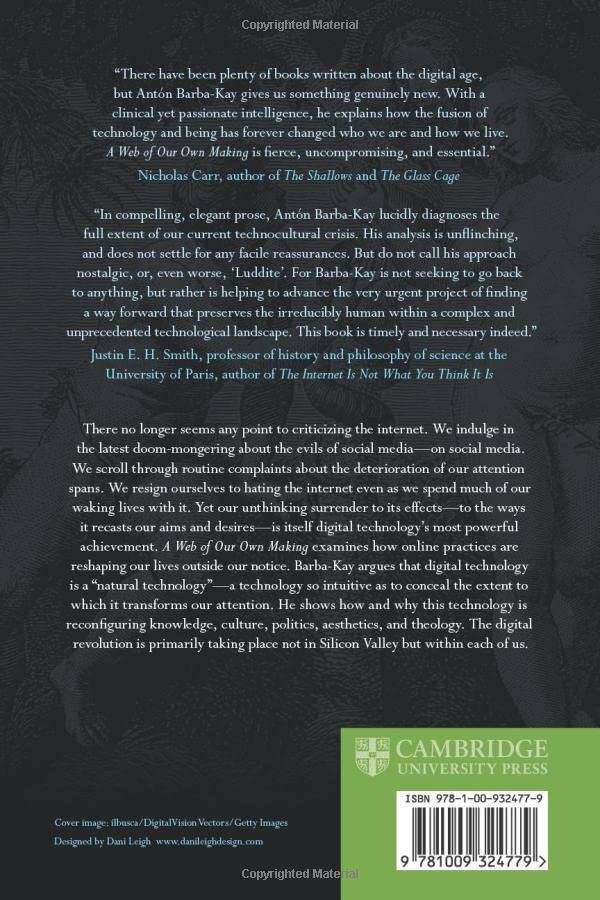 There no longer seems any point to criticizing the internet. We indulge in the latest doom-mongering about the evils of social media-on social media. We scroll through routine complaints about the deterioration of our attention spans. We resign ourselves to hating the internet even as we spend much of our waking lives with it. Yet our unthinking surrender to its effects-to the ways it recasts our aims and desires-is itself digital technology’s most powerful achievement. A Web of Our Own Making examines how online practices are reshaping our lives outside our notice. Barba-Kay argues that digital technology is a ‘natural technology’-a technology so intuitive as to conceal the extent to which it transforms our attention. He shows how and why this technology is reconfiguring knowledge, culture, politics, aesthetics, and theology. The digital revolution is primarily taking place not in Silicon Valley but within each of us.