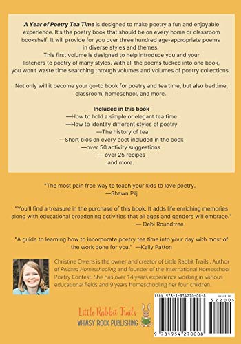 The is the original A Year of Poetry Tea Time book. Have you heard of “poetry tea time,” but you’re not sure how to do it? Or you want to share poetry with your children or class but afraid they’ll find it to be “boring”? Then this is the book for you!A Year of Poetry Tea Time is designed to make poetry a fun and enjoyable experience. It’s the poetry book that should be on every home or classroom bookshelf. It will provide for you three hundred, age-appropriate poems in diverse styles and themes. This first volume is designed to help introduce you and your listeners to poetry of many styles. With all the poems tucked into one book, you won’t have to search through volumes and volumes of poetry collections. Not only will it become your go-to book for poetry tea time, but also bedtime, mom school, classroom, homeschool, and more. You will learn how to hold an intimate to large poetry tea time, how to identify different styles of poetry, the history of tea, short bios on every poet included in the book, and more. You will also find great tea time recipes with which to adorn your table or picnic blanket. I promise you that if you use this book for your poetry tea time you will have fresh new poetry all year long and everything you need to make your tea time a success. Not only will it save you a lot of time, but it will make it a breeze to put poetry team time together. Your guests (your children, class, or friends) will have a meaningful experience, boys and girls alike. Yep! Boys love poetry tea time too. You can be ready for a quick, impromptu poetry tea time by the time the water boils. Not only does the book provide poetry and recipes for tasty treats, it is stuffed with so much more.Features that are included in this book:–You can find the definition of challenging words right under the poem for quick reference–300+ poems; enough to read one poem every weekday of the year–A glossary of over 270+ terms and the poems they are found in–130 mini poet bios stuffed full of facts–56 quotes by famous poets to evoke creativity and inspiration–60+ activity suggestions –Poems can be looked up by poet, theme, and country –Chapters are organized by monthly themes for quick relevant poetry–A section for you to write your own poetry–The history of tea–Learn about different kinds of tea–Learn about herbal tea and how to make your own–Learn correct tea etiquette–25+ Recipes for simple and elegant, child-friendly, tea-time treats–Explanation of poetry styles and terms–Field trip suggestions–Learn how to host a poetry tea timeAnd MoreThis collection will give you everything you need, neatly nestled between the covers of a single book.After over twenty years of collecting poetry and reading it to children, in schools and at home, I have found that children of all ages enjoy poetry whether silly or thought provoking. With the right exposure, children from ages two to seventeen can learn to appreciate the poetry of A. A. Milne, as well as enjoy Longfellow and Shakespeare. Not only do children start to understand literary concepts, like imagery and rhyme, they also expand their minds with a rich vocabulary and learn the complexity of emotions. Thousands of families around the world are already enjoying the magic that comes from sharing poetry. Gathering around the table, sharing glances while sipping on tea, and pondering the poetry that is being read or recited. Laughter, discussion, and smells fill the air as participants share their thoughts on a passage. This scene can be yours.Don’t put off poetry until your children are older. Now is the time to heat up the water and pull out your tea. Establish a love for poetry now. Don’t deprive your children of this mind changing experience. It’s especially great for those who may be reluctant to listen to books. It’s time to read poetry and watch the wheels turn in the little heads that you’re reading to. Build bonds and build minds starting today. Buy your copy today!