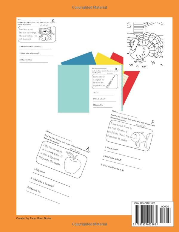 This workbook enhances reading comprehension, vocabulary, and fine motor skills for first-grade students through engaging stories and coloring activities.