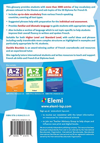 Part of the A-Z series from Elemi which aims to support students throughout their IB Diploma studies, this A-Z for French B provides a glossary of French-English vocabulary: Essential vocabulary and key phrases organized in topics to reflect the five conceptual themes of IB Diploma French B. Entirely focused on the needs of the IB Diploma curriculum, students learn and engage with current topical vocabulary across a variety of text types. Provides a useful reference to help students express their own ideas and opinions in written and spoken French. Offers a range of appropriate vocabulary and key phrases to develop students’ interactive skills and help them maintain a conversation. Suitable for both HL and SL studies. This popular book specifically offers help with: learning and engaging with appropriate and varied vocabulary in topic-by-topic lists developing extended writing in a variety of text types supporting speaking skills, particularly oral presentations and discussions as part of the internal assessment.