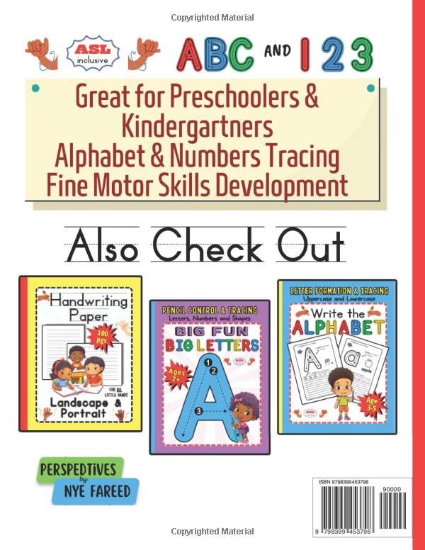 Embark on a captivating journey of learning with “ABC and 123 Learn to Write: For ALL Little Hands” – a comprehensive workbook designed to inspire preschoolers and kindergarteners to master the art of writing the alphabet, numbers, and shapes! Developed by an Education Specialist (M.Ed.) this inclusive workbook celebrates diversity and empowers children of all backgrounds. It is thoughtfully designed to cater to the unique needs of ALL learners. With over 100 practice pages, this engaging workbook provides a wealth of opportunities for young learners to develop their skills in letter, number, and shape formation. Each concept is accompanied by dedicated tracing sheets, ensuring that children gain confidence and finesse in their fine motor skills. Key Features: 100+ practice pages: Abundant practice to reinforce letter, number, and shape recognition and formation. Repetition: Multiple pages of tracing activities for each letter, number, and shape, fostering mastery through consistent practice. Inclusive ASL alphabet: The ASL alphabet is integrated into the tracing pages, fostering inclusivity and embracing diverse communication methods. Large size (8.5 x 11 in): Provides generous space for little hands to develop writing skills comfortably. Develops fine motor skills: Tracing letters, numbers, and shapes aids in the development of hand-eye coordination and fine motor control. Ideal for homeschooling and preschoolers: An invaluable resource for parents, caregivers, and educators seeking to provide a comprehensive and inclusive learning experience. “ABC and 123 Learn to Write: For ALL Little Hands” is not just a workbook; it’s a gateway to a world of knowledge and self-expression. Join us as we embark on this exciting learning adventure, where children of all colors and abilities can thrive. Unlock the power of the alphabet, numbers, and shapes, and witness your child’s confidence soar as they become skilled writers. Embrace the inclusive spirit of “ABC and 123 Learn to Write: For ALL Little Hands” and invite your child to discover the joy of learning!
