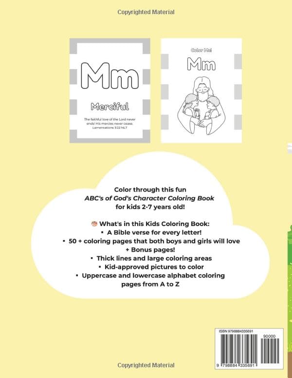 Color through this fun ABC’s of God’s Character Coloring Book for kids 2-7 years old! What’s in this Kids Coloring Book: # Bible Verse for every letter! # 50 + coloring pages that both boys and girls will love + 4 Bonus Pages # Thick lines and large coloring areas # Kid-approved pictures to color # Uppercase and lowercase alphabet coloring pages from A to Z Great for children ages 2-7!