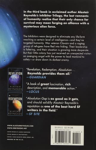 In the third book of the legendary Revelation Space trilogy, the last remnants of humanity realize that forging an alliance with a greater and even more mysterious alien force may be their only chance for survival. The Inhibitors were designed to eliminate any life form reaching a certain level of intelligence — and they’ve targeted Humanity. War veteran Clavain and a ragtag group of refugees have fled into hiding. Their leadership is faltering, and their situation is growing more desperate. But their little colony has just received an unexpected visitor: an avenging angel with the power to lead mankind to safety — or draw down its darkest enemy. And as she leads them to an apparently insignificant moon light-years away, it begins to dawn on Clavain and his companions that to beat one enemy, it may be necessary to forge an alliance with something much worse . . . “Absolution Gap is a good as it gets, and should solidify Alastair Reynolds’ reputation as one of the best hard SF writers in the field.” — SF Site