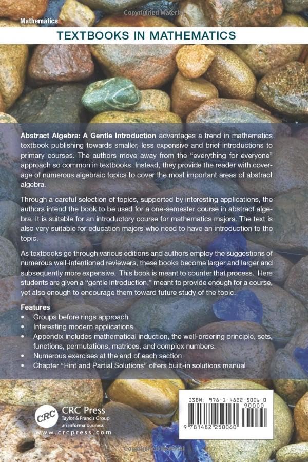 Abstract Algebra: A Gentle Introduction advantages a trend in mathematics textbook publishing towards smaller, less expensive and brief introductions to primary courses. The authors move away from the ‘everything for everyone’ approach so common in textbooks. Instead, they provide the reader with coverage of numerous algebraic topics to cover the most important areas of abstract algebra. Through a careful selection of topics, supported by interesting applications, the authors Intend the book to be used for a one-semester course in abstract algebra. It is suitable for an introductory course in for mathematics majors. The text is also very suitable for education majors who need to have an introduction to the topic. As textbooks go through various editions and authors employ the suggestions of numerous well-intentioned reviewers, these book become larger and larger and subsequently more expensive. This book is meant to counter that process. Here students are given a “gentle introduction,” meant to provide enough for a course, yet also enough to encourage them toward future study of the topic. Features Groups before rings approach Interesting modern applications Appendix includes mathematical induction, the well-ordering principle, sets, functions, permutations, matrices, and complex nubers. Numerous exercises at the end of each section Chapter “Hint and Partial Solutions” offers built in solutions manual