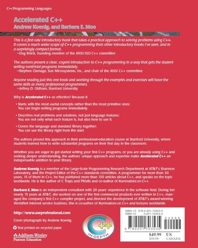 Want to learn how to program in C++ immediately? Want to start writing better, more powerful C++ programs today? Accelerated C++’s uniquely modern approach will help you learn faster and more fluently than you ever believed possible. Based on the authors’ intensive summer C++ courses at Stanford University, Accelerated C++ covers virtually every concept that most professional C++ programmers will ever use — but it turns the “traditional” C++ curriculum upside down, starting with the high-level C++ data structures and algorithms that let you write robust programs immediately. Once you’re getting results, Accelerated C++ takes you “under the hood,” introducing complex language features such as memory management in context, and explaining exactly how and when to use them. From start to finish, the book concentrates on solving problems, rather than learning language and library features for their own sake. The result: You’ll be writing real-world programs in no time — and outstanding code faster than you ever imagined.