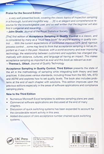 Acceptance Sampling in Quality Control, Third Edition presents the state of the art in the methodology of sampling while integrating both theory and best practices. It discusses various standards, including those from the ISO, MIL-STD and ASTM and explores how to set quality levels. The book also includes problems at the end of each chapter with solutions. This edition improves upon theprevious editions especially in the areas of software applications and compliance sampling plans. New to the Third Edition: Numerous Microsoft Excel templates to address sampling plans are used. Commercial software applications are discussed at the end of many chapters. Discussion of quick switching systems has been expanded to account for the considerable recent activity in this area. Added discussion of zero acceptance number chained quick switching systems.