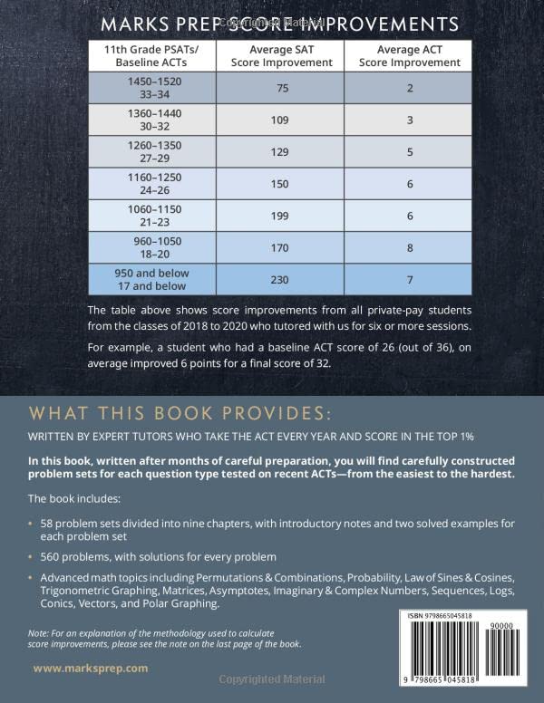This book, written by tutors who take the ACT and score in the top 1%, includes: 58 problem sets divided into nine chapters, with introductory notes and solved examples for each problem set 560 problems, with solutions for every problem Advanced math topics including Permutations and Combinations, Probability, Law of Sines and Cosines, Trigonometric Graphing, Matrices, Asymptotes, Imaginary and Complex Numbers, Sequences, Logs, Conics, Vectors, and Polar Graphing.