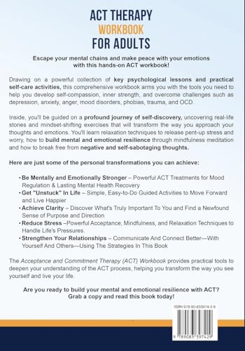 Note: Bonus ACT Mini Guide + 21-Day Action Plan Inside Break free from unhelpful and distressing thoughts, master challenging emotions, and strengthen your mental and emotional resilience with this comprehensive and user-friendly ACT Therapy Workbook. Acceptance and Commitment Therapy (ACT) is one of the most effective ways to strengthen your mindset, improve your emotional health, and build resilience. It achieves this through key psychological lessons taught through simple yet highly effective self-improvement exercises you can do anywhere. This comprehensive self-help workbook is a simple and non-technical approach to ACT. It will teach you how to embrace acceptance, mindfulness, and self-compassion. It will also help you unlock a vital wellspring of inner peace and strength you never thought you had in you. Whether you’re battling anxiety, depression, anger, shame, mood disorders, inner chaos, phobias, chronic pain, OCD, or simply striving for a happier, more fulfilled life, this book offers a powerful blueprint for mental and emotional freedom. Why Choose This Workbook? ACT Therapy Workbook for Adults goes beyond traditional therapy books by integrating elements of Dialectical Behavior Therapy (DBT) and Cognitive Behavioral Therapy (CBT), offering a rounded approach to managing emotional and psychological challenges. It’s not just about coping–it’s about thriving. Here are just some of the personal transformations you can achieve: Be Mentally and Emotionally Stronger: Be better at adapting to life’s happy ups and devastating downs–without breaking. Be more resilient in the face of change and challenges. Be Free from Self-Damaging Thoughts: Read the real-life story of Lizzie (page 58) and how a “joke” (from a family member, no less!) wrecked her self-esteem since childhood. Discover how ACT helped her finally escape this mental trap and how you can use it too! Get “Unstuck” In Life: You’re unhappy or know your life can be better, but HOW do you do it? The easy-to-do, guided ACT therapy activities in this book will show you what steps to take. Achieve Clarity: Unhappiness usually stems from a MISMATCH between what you want and what you’re doing. Discover what’s truly important to you (page 90) and find a newfound sense of purpose and direction. Reduce Your Stress: Learn powerful acceptance, mindfulness, and relaxation techniques to handle life’s pressures. Strengthen Your Relationships: Communicate and connect better–with yourself and others–using the strategies in this book. Manage Chronic Pain Better: Improve your quality of life by altering your relationship with pain, enabling you to function better despite chronic conditions. (There’s a specific exercise for this on page 86.) And More… Your Journey to a Happier You Starts Here… Whether you’re new to ACT or looking for material to supplement your healing journey, this ACT manual is your gateway to a life aligned with your values and desires. (It’s also an invaluable tool for therapists, providing ACT-aligned activities to help clients in making lasting changes.) So, if you want to stop struggling and start thriving,then scroll up and click the “Add to Cart” button right now!