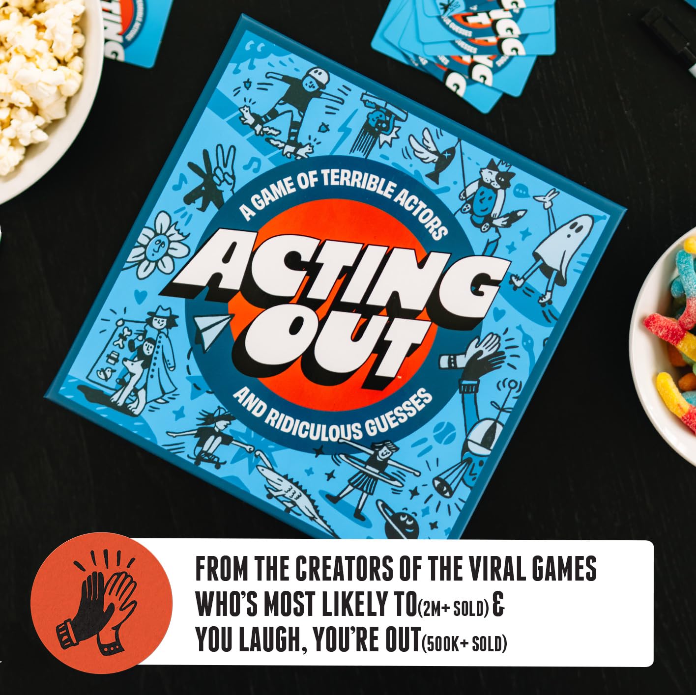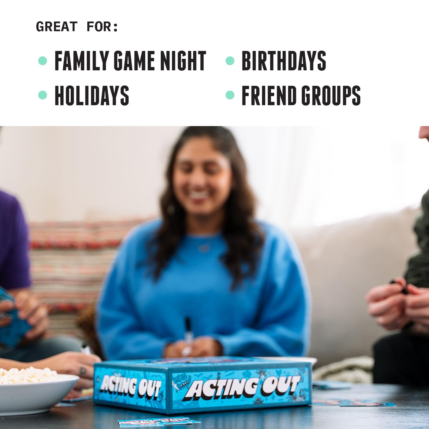 - Acting Out: A game of terrible actors and ridiculous guesses! Grab your friends or family and get ready for a hilarious, family-friendly game night. With funny cards, even funnier acting, and game night glory on the line, this family card game for kids and adults will be a household favorite.