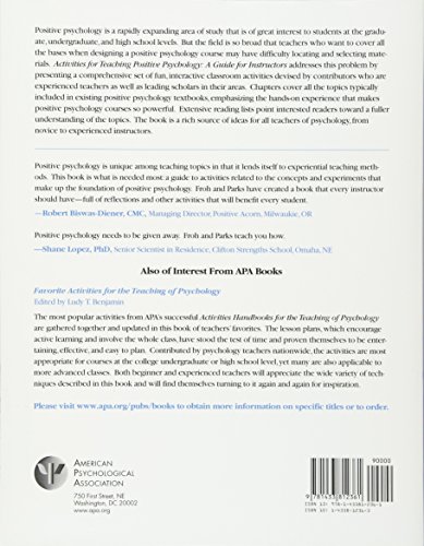 Positive psychology is a rapidly expanding area of study that is of great interest to students at the graduate, undergraduate, and high school levels. But the field is so broad that teachers who want to cover all the bases when designing a positive psychology course may have difficulty locating and selecting materials. Activities for Teaching Positive Psychology addresses this problem by presenting a comprehensive set of fun, interactive classroom activities devised by contributors who are experienced teachers as well as leading scholars in their areas. Chapters cover all the topics typically included in existing positive psychology textbooks, emphasizing the hands-on experience that makes positive psychology courses so powerful. Extensive reading lists point interested readers towards a fuller understanding of the topics. The book is a rich source of ideas for all teachers of psychology, from novice to experienced instructors.