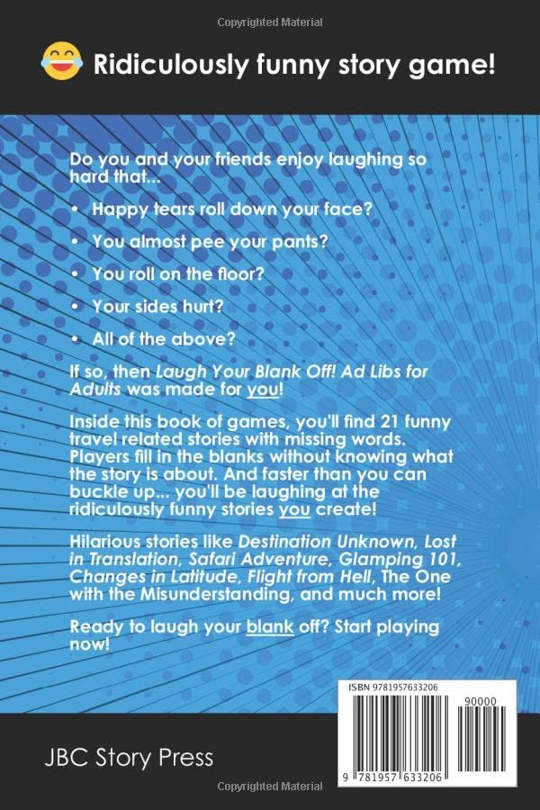 Instant Laughs for You and Your Friends! Do you and your friends enjoy laughing so hard that… Happy tears roll down your face? You almost pee your pants? You roll on the floor? Your sides hurt? All of the above? If so, then Laugh Your Blank Off! Ad Libs for Adults was made for you! Fun for road trips, parties and just hanging out This game is perfect for vacation or holiday trips, parties of all sizes, or just hanging out with friends. Players don’t even have to be in the same room. Playing through video chat works great too! Inside you’ll find 21 entertaining travel-themed stories with missing words. Players fill in the blanks without knowing what the story is about. And faster than you can buckle up… you’ll be laughing at the ridiculously funny story you created! Story topics for the Travel Edition include: Lost in Translation Destination Unknown Glamping 101 Safari Adventure The One with the Misunderstanding Flight From Hell Traveling Circus Hollywood Ending Travel Influencer And much more! Funny Word Game for “Grownups” This version of the game is for adults. That means stories may contain references to alcohol, romance, and other crazy adult stuff (you know, like work or parenting). Whether stories include “adult” language is up to you! Some players like to include spicy swear words. Others prefer to keep it sweet and swear-free. It’s your call! You’ll love playing Laugh Your Blank Off! because ridiculous fun with friends and family is guaranteed every time. Get it today! Scroll to the top of the screen and click the Buy Now button!