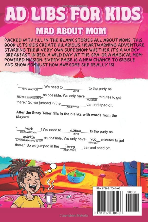 Ad Libs For Kids: Mad About Mom is a laugh-out-loud fill-in-the-blank book that celebrates just how amazing (and hilarious!) moms can be! Packed with silly, heartwarming stories all about Mom Kids create their own wacky adventures by filling in the blanks From spa days to superhero missions–Mom does it all! Makes the perfect gift for birthdays, Mother’s Day, or just because A fun way for kids to show love and appreciation for their supermom Get ready to giggle, get creative, and go totally mad about Mom!