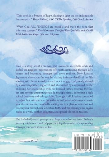 This is a story about a woman who overcame incredible odds and defied the negative expectations of society, navigating through life’s storms and becoming stronger and more resilient. Now Lindsay Jepperson shows you the way by sharing intimate details of her life starting with being sexually abused as a young girl, physically abused by a cruel stepfather, neglected and abandoned by a depressed mother, losing her relationship with her beloved father, entering the foster care system, attempting suicide multiple times, becoming a high school drop-out and a drug addict. Through it all, Lindsay continued to adjust her sails and use the setbacks and winds of change to navigate the turbulence, eventually leading her to a place of salvation and redemption through her Christian faith, and the blessings she enjoys today as a wife, mother, volunteer, and special education teacher. The included journal prompts can help you reflect on how Lindsay’s journey might teach and help you develop the resolve to keep moving through your own storms of life.