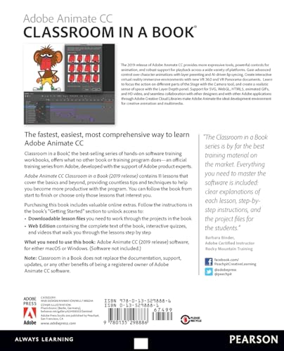 Creative professionals seeking the fastest, easiest, most comprehensive way to learn Adobe Animate choose Adobe Animate CC Classroom in a Book from Adobe Press. The project-based lessons in this book show users step-by-step the key techniques for working in Animate. Adobe Animate CC provides more expressive tools, powerful controls for animation, and robust support for playback across a wide variety of platforms. The online companion files include all the necessary assets for readers to complete the projects featured in each chapter. All buyers of the book get full access to the Web Edition: a Web-based version of the complete eBook enhanced with video and interactive multiple-choice quizzes.