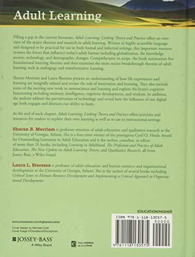 Solidly grounded in theory and research, but concise and practice-oriented, Adult Learning: Linking Theory and Practice is perfect for master’s-level students and practitioners alike. Sharan Merriam and Laura Bierema have infused each chapter with practical applications for instruction which will help readers personally relate to the material. The contents covers: Adult Learning in Today’s World Traditional Learning Theories Andragogy Self-Directed Learning Transformative Learning Experience and Learning Body and Spirit in Learning Motivation and Learning The Brain and Cognitive Functioning Adult Learning in the Digital Age Critical Thinking and Critical Perspectives Culture and Context Discussion questions and activities for reflection are included at the end of each chapter.