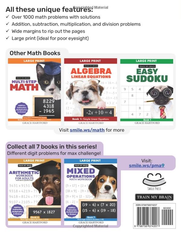 A fun Math workbook, with unique features: Over 1000 math problems Addition, subtraction, multiplication, and division problems Wide margins to rip out the pages Large print (Ideal for poor vision) Complete solutions Plus all these mental benefits: Train your brain: A fun way to employ logic, and cognitive skills! Studies demonstrate that math problems stimulate the parts of the brain affected by dementia and Alzheimer’s. De-stress: The math problems offer a fun and satisfying challenge, which is a great way to de-stress and relax. Available in 8 formats for maximum challenge: Book 1: Two-digit math problems (Numbers 10-99) Book 2: Three-digit math problems (Numbers 100-999) Book 3: Four-digit math problems (Numbers 1000-9999) Book 4: Mixed digit math problems (Numbers 10-999) Book 5: Mixed digit math problems (Numbers 10-9999) Book 6: Mixed problems (Numbers 1-9999) Book 7: Mixed operations (Numbers 1-99) Special Book 8: Simple Math Review Workbook with tuition and practice The product on this page is Book 1: Two-digit math problems (Numbers 10-99) It’s the perfect gift! Treat yourself or a loved one to a book that offers plenty of fun while keeping the mind sharp!