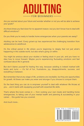 Are you worried about your future and wonder whether or not you will be able to achieve your goals? Here’s what you need to have in order to survive and thrive in life – get ready to overcome challenges with wisdom and confidence! Are there times you feel down for no apparent reason, but you don’t know how to deal with difficult emotions? Do you think you’re ready to handle home emergencies when your parents are away? Adulting can be hard. Every grown-up has experienced the challenging transition from adolescence to adulthood. It’s the critical period in life where you’re beginning to deeply feel not just what’s happening in the outside world, but also what’s going on within. You might be anxious about your studies or feeling stuck in your job, and you have no idea how to move forward. Maybe you’re experiencing fluctuating emotions and feel confused about life in general. But don’t blame yourself for feeling this way, because adulting is indeed marked with twists and turns — it’s full of fun, frustrations, joy, disappointments, success, and everything in between. But remember that at any stage of life, problems are inevitable, but they are opportunities for growth. All these can make you wiser and stronger if you choose to conquer them. So the best thing you can do is empower yourself to deal with whatever life throws at you… and it starts with equipping yourself with essential life skills. That’s where this book comes in — from cooking your own meals and handling home emergencies, to taking care of your mental health and planning and succeeding in your career… this guide has you covered. Inside, here’s just a fraction of what you will discover: The link between your mental and physical health — and how to take care of your well-being so you can overcome setbacks and be calm during stressful times Simple and easy meals with 5 ingredients or less you can cook on your own How to handle 20 common home and road emergencies How to do basic car repairs and maintenance to save money at the auto shop Why you should invest while you’re young — and 7 smart investment ideas that can help you grow your money How to pay off your debt in less than a year How to set realistic goals — and 5 effective time management strategies to help you achieve them How to communicate politely yet assertively so you can resolve conflicts and build healthy relationships 5 steps to creating a career development plan to establish yourself and achieve success at work And much more. Even if you’re not sure yet about what you want to do with your life, this book will also guide you to discover your purpose and find a sense of direction… helping you focus your time and energy on things that truly matter to you. Don’t delay having the crucial skills to survive adulthood and build a strong foundation for success. Now is the best time to work on it! If you want to navigate adulthood with wisdom so you can be happy, strong, and successful, then scroll up and click the “Add to Cart” button right now.